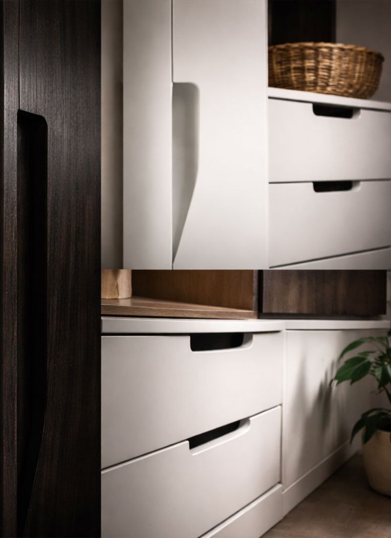 Specijalno oblikovane ručke predstavljaju savremeno rešenje za funkcionalno i estetski čisto otvaranje nameštaja.